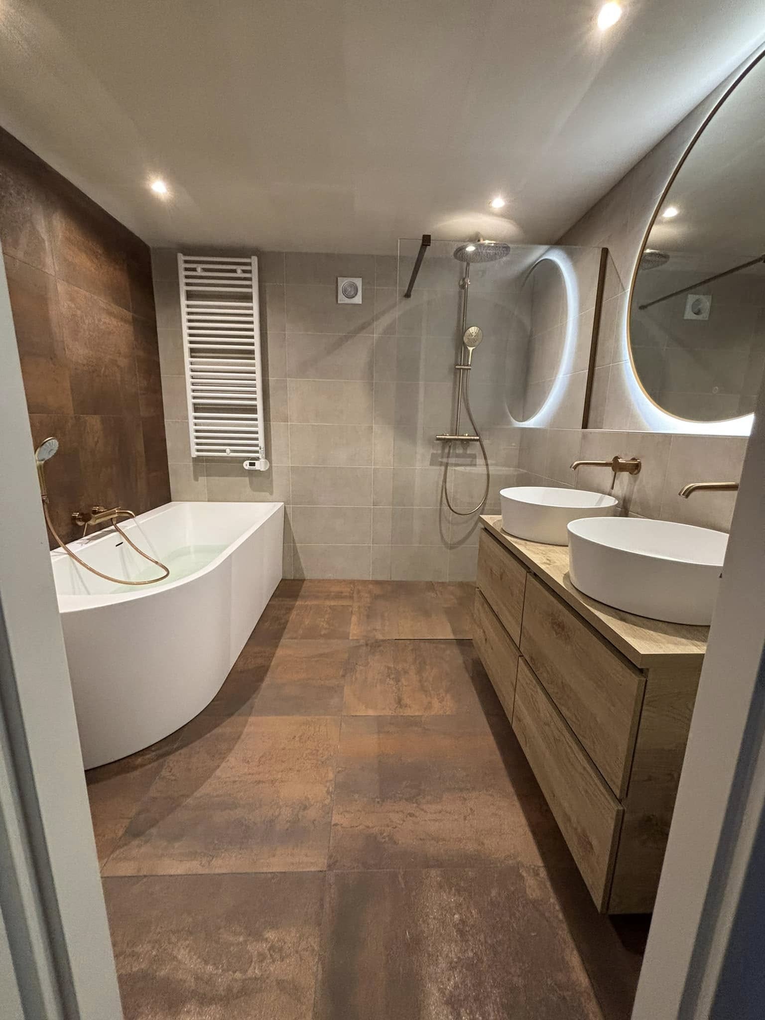 Deze prachtige badkamer is een ware blikvanger geworden, met een unieke mix van Japandi-stijl en hotel-chique elementen. De warme kleuren van de tegels, in combinatie met het witte sanitair en de elegante goud- en koperen kranen, geven de badkamer een tijdloze uitstraling die zowel stijlvol als rustgevend is. De ruimte is voorzien van vloerverwarming, waardoor de badkamer altijd comfortabel is, en een luxe inloopdouche met een regenkop, ideaal voor een verfrissende start van de dag. Daarnaast is er een heerlijk bad, perfect om in te ontspannen na een lange werkdag. Het badmeubel van licht eikenhout vormt een prachtig contrast met de koperen kranen en de strakke spiegel, wat zorgt voor een geheel.