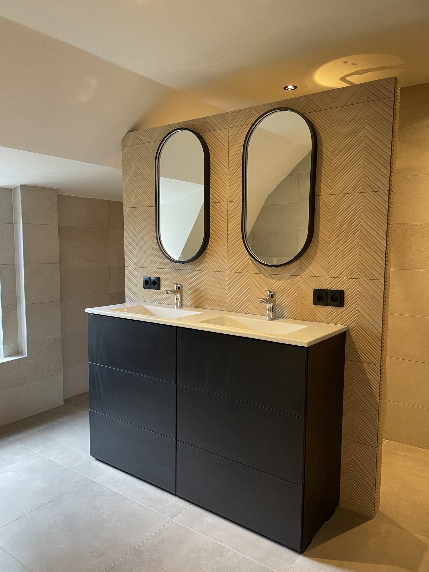 • De wanden achter de wastafel en in de douche zijn voorzien van decoratieve tegels met een Hongaarse puntmotief. Dit voegt een speels en visueel interessant element toe aan de ruimte, zonder de kalmte en eenvoud van het ontwerp te verstoren. Het subtiele patroon trekt de aandacht en geeft de badkamer een uniek karakter.